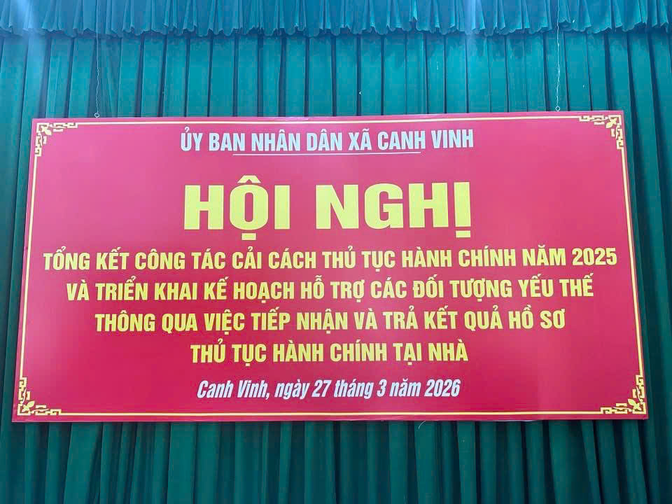 Ngày 27/3/2026, Ủy ban Nhân dân xã Canh Vinh đã tổ chức hội nghị tổng kết công tác cải cách thủ tục hành chính năm 2025, đồng thời triển khai kế hoạch hỗ trợ các đối tượng yếu thế thông qua việc tiếp nhận và trả kết quả hồ sơ thủ tục hành chính tại nhà.