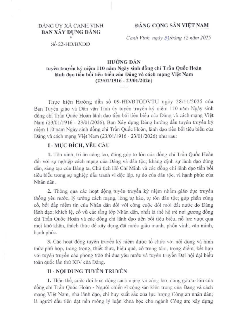 HƯỚNG DẪN tuyên truyền kỷ niệm 110 năm Ngày sinh đồng chí Trần Quốc Hoàn lãnh đạo tiền bối tiêu biểu của Đảng và cách mạng Việt Nam (23/01/1916-23/01/2026)