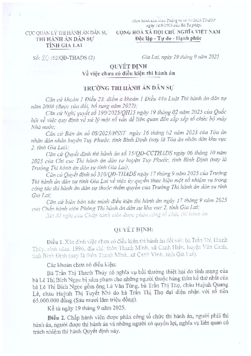 Niêm yết công khai Quyết định số 20/52/QĐ-THADS ngày 19/9/2025 của Thi hành án Dân sự tỉnh Gia Lai về việc chưa có điều kiện thi hành án 15/12/2025, 08:41:13 - Lượt xem: 8 Tweet Thêm vào danh sách Báo xấu Thông tin tài liệu Niêm yết công khai Quyết định số 20/52/QĐ-THADS ngày 19/9/2025 của Thi hành án Dân sự tỉnh Gia Lai về việc chưa có điều kiện thi hành án