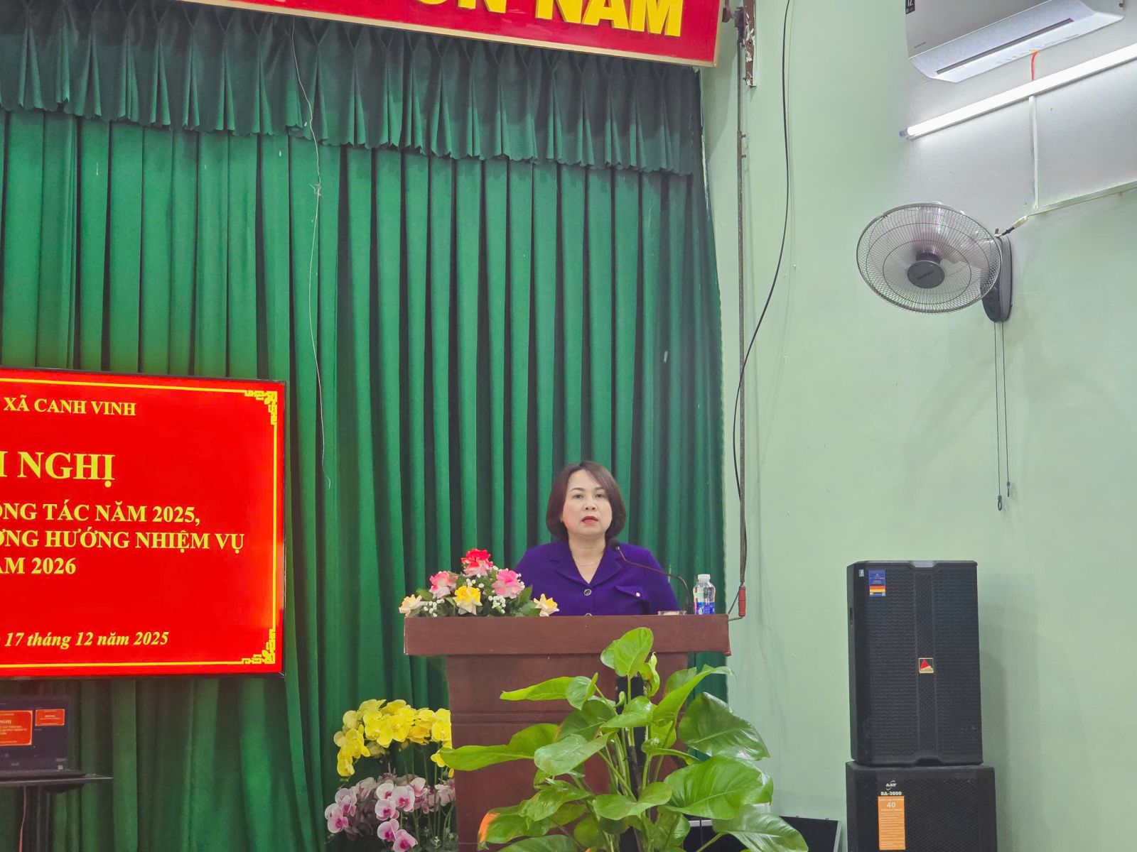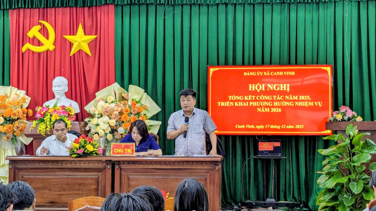 Đồng chí lãnh đạo Đảng ủy xã phát biểu chỉ đạo tại hội nghị, nhấn mạnh việc tiếp tục phát huy những kết quả đạt được, khắc phục những hạn chế, tập trung thực hiện hiệu quả các mục tiêu, nhiệm vụ trọng tâm trong năm 2026, góp phần xây dựng xã Canh Vinh ngày càng phát triển bền vững.