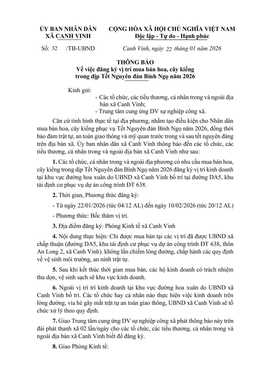 Thứ năm, 22/01/2026 | 21:39 A- A A+ | THÔNG BÁO Về việc đăng ký vị trí mua bán hoa, cây kiểng trong dịp Tết Nguyên đán Bính Ngọ năm 2026 Chia sẻ Đọc bài Lưu UBND xã Canh Vinh Tập tin đính kèm Trình duyệt không hỗ trợ iframe. Tác giả: UBND xã Canh Vinh