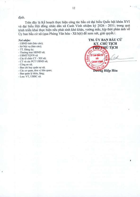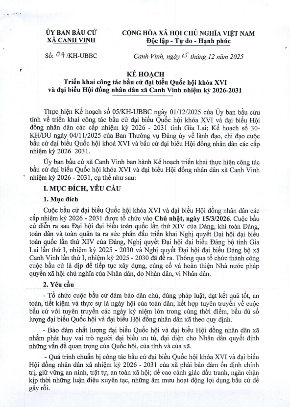 Thứ hai, 15/12/2025 | 17:12 A- A A+ | KẾ HOẠCH Triển khai công tác bầu cử đại biểu Quốc hội khóa XVI và đại biểu Hội đồng nhân dân xã Canh Vinh nhiệm kỳ 2026-2031 Chia sẻ Đọc bài Lưu (canhvinh.gialai.gov.vn) - Ngày 15/12/2025 Ủy ban bầu cử xã Canh Vinh triển khai KẾ HOẠCH Triển khai công tác bầu cử đại biểu Quốc hội khóa XVI và đại biểu Hội đồng nhân dân xã Canh Vinh nhiệm kỳ 2026-2031 Tập tin đính kèm Trình duyệt không hỗ trợ iframe.
