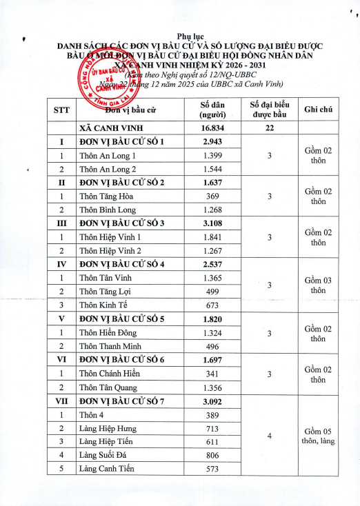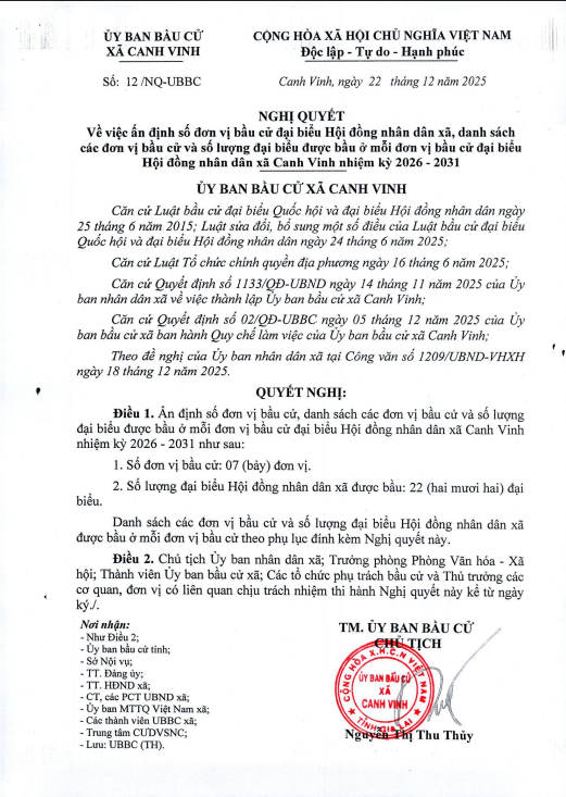 NGHỊ QUYẾT Về việc ấn định số đơn vị bầu cử đại biểu Hội đồng nhân dân xã, danh sách các đơn vị bầu cử và số lượng đại biểu được bầu ở mỗi đơn vị bầu cử đại biểu Hội đồng nhân dân xã Canh Vinh nhiệm kỳ 2026-2031
