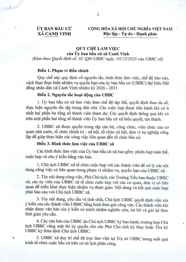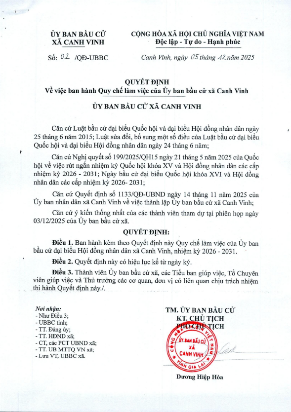 Thứ hai, 15/12/2025 | 17:23 A- A A+ | QUYẾT ĐỊNH Về việc ban hành Quy chế làm việc của Ủy ban bầu cử xã Canh Vinh Chia sẻ Đọc bài Lưu (canhvinh.gialai.gov.vn) - Ngày 15/12/2025 Ủy ban bầu cử xã Canh Vinh triển khai QUYẾT ĐỊNH Về việc ban hành Quy chế làm việc của Ủy ban bầu cử xã Canh Vinh Tập tin đính kèm Trình duyệt không hỗ trợ iframe.
