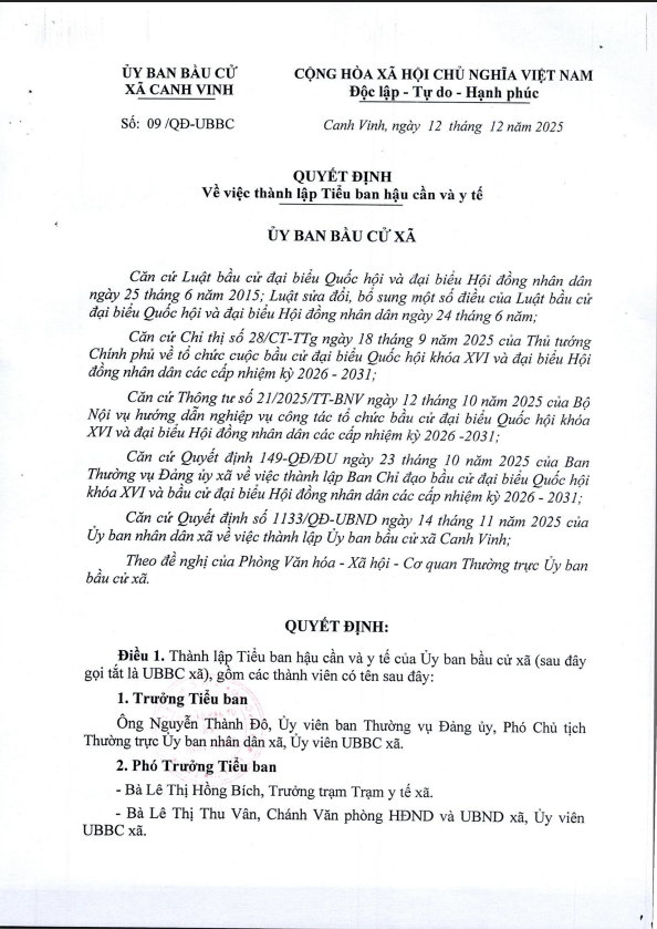 Thứ hai, 15/12/2025 | 17:43 A- A A+ | QUYẾT ĐỊNH Về việc thành lập Tiểu ban hậu cần và y tế Chia sẻ Đọc bài Lưu (canhvinh.gialai.gov.vn) - Ngày 15/12/2025 Ủy ban bầu cử xã Canh Vinh triển khai QUYẾT ĐỊNH Về việc thành lập Tiểu ban hậu cần và y tế Tập tin đính kèm Trình duyệt không hỗ trợ iframe.