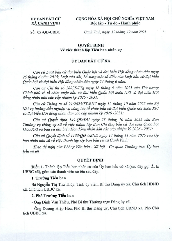Thứ hai, 15/12/2025 | 17:46 A- A A+ | QUYẾT ĐỊNH Về việc thành lập Tiểu ban nhân sự Chia sẻ Đọc bài Lưu (canhvinh.gialai.gov.vn) - Ngày 15/12/2025 Ủy ban bầu cử xã Canh Vinh triển khai QUYẾT ĐỊNH Về việc thành lập Tiểu ban nhân sự Tập tin đính kèm Trình duyệt không hỗ trợ iframe.