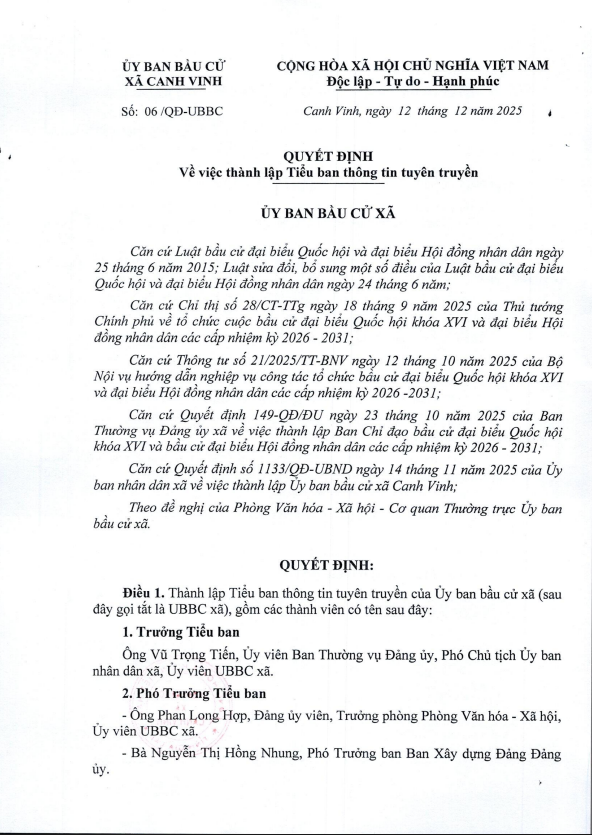 Thứ hai, 15/12/2025 | 17:50 A- A A+ | QUYẾT ĐỊNH Về việc thành lập Tiểu ban thông tin tuyên truyền Chia sẻ Đọc bài Lưu (canhvinh.gialai.gov.vn) - Ngày 15/12/2025 Ủy ban bầu cử xã Canh Vinh triển khai QUYẾT ĐỊNH Về việc thành lập Tiểu ban thông tin tuyên truyền Tập tin đính kèm Trình duyệt không hỗ trợ iframe.