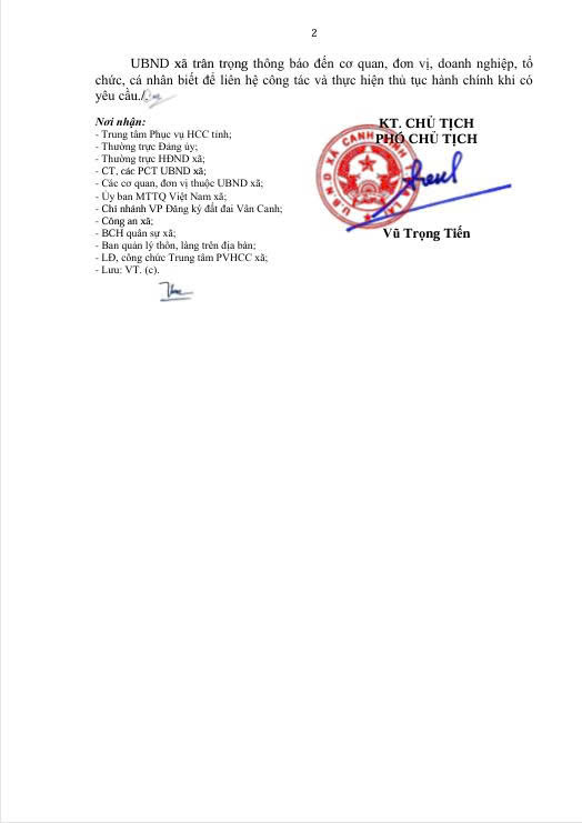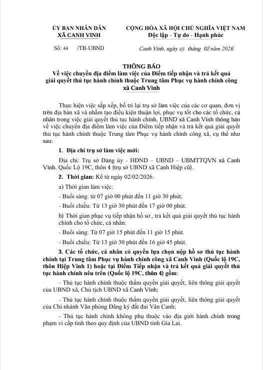 UBND xã Canh Vinh thông báo chuyển địa điểm làm việc của Điểm tiếp nhận và trả kết quả giải quyết thủ tục hành chính thuộc Trung tâm phục vụ Hành chính công xã Canh Vinh.