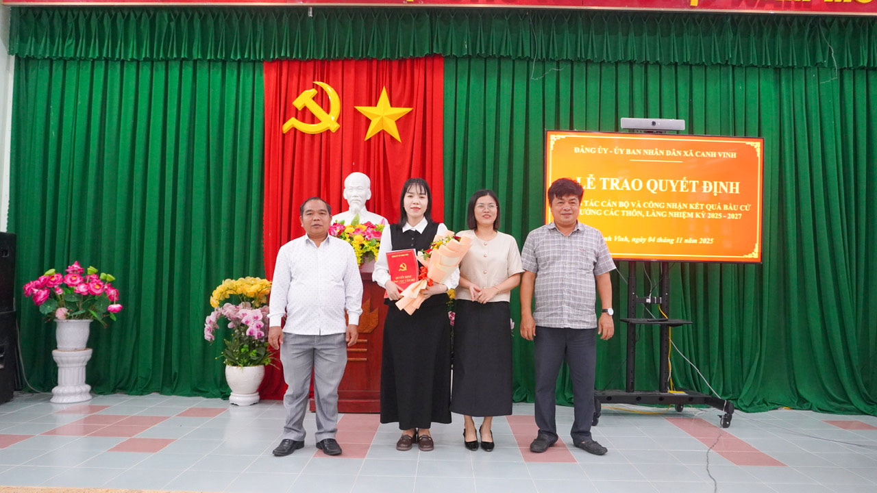 Tại buổi lễ, lãnh đạo xã đã trao Quyết định công nhận kết quả bầu cử Trưởng thôn, làng cho các đồng chí được nhân dân tín nhiệm, đồng thời trao Quyết định bổ nhiệm chức danh Phó Trưởng ban Ban Xây dựng Đảng xã Canh Vinh đối với đồng chí Nguyễn Thị Hồng Nhung.