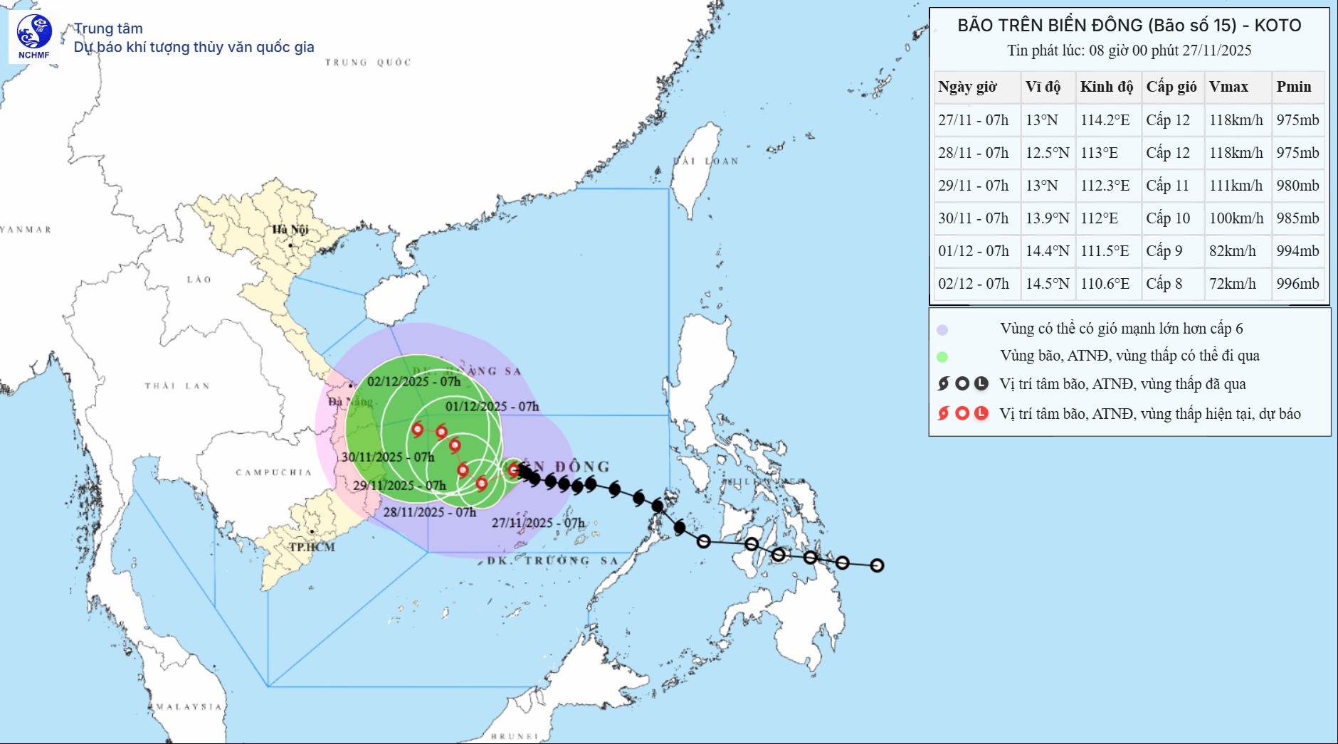 | 07 giờ ngày 28/11 | Tây Tây Nam, 5-10km/h | 12,5N-113,0E; trên vùng biển phía Tây khu vực Giữa Biển Đông, cách đảo Song Tử Tây khoảng 200km về phía Tây Bắc | Cấp 12, giật cấp 15 | Vĩ tuyến 11,00N-15,00N; Kinh tuyến 111,50E-116,00E | Cấp 3: khu vực Giữa Biển Đông (bao gồm vùng biển phía Bắc đặc khu Trường Sa) |