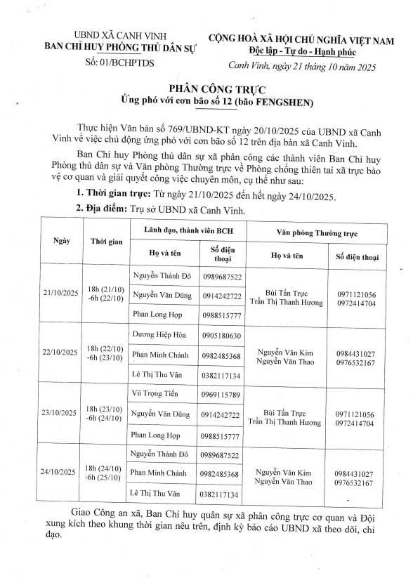 (canhvinh.gialai.gov.vn) - Thời gian trực: Từ ngày 21/10/2025 đến hết ngày 24/10/2025. Địa điểm: Trụ sở UBND xã Canh Vinh.