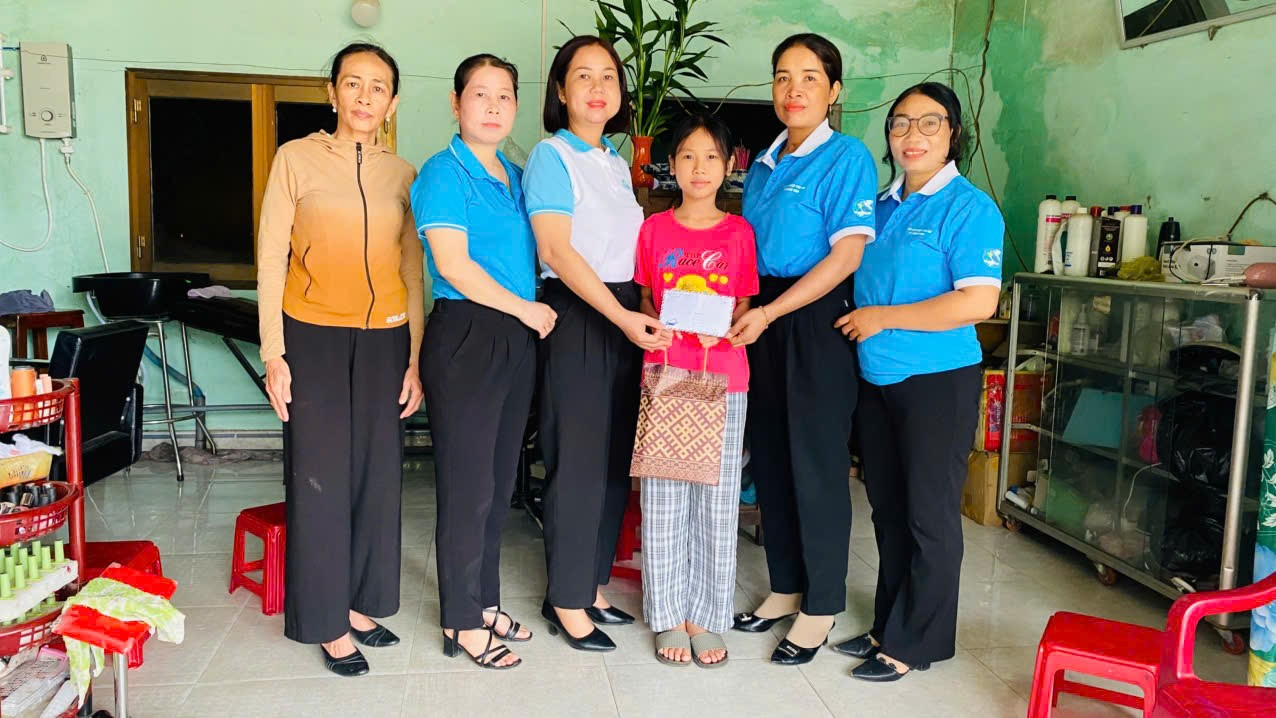 Hình ảnh: Cán bộ Hội LHPN xã Canh Vinh trao quà Chương trình “Mẹ đỡ đầu” cho em Huỳnh Hồ Bảo Thi