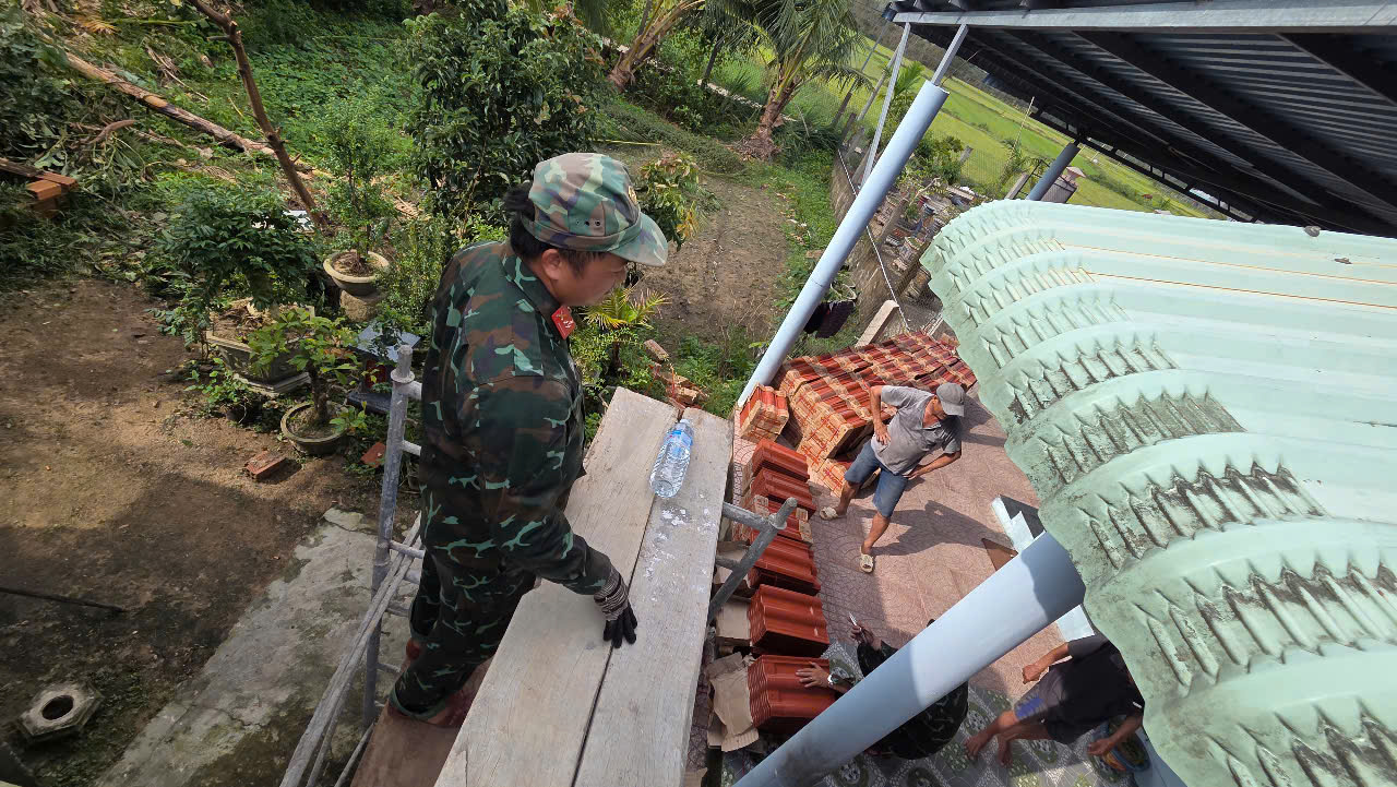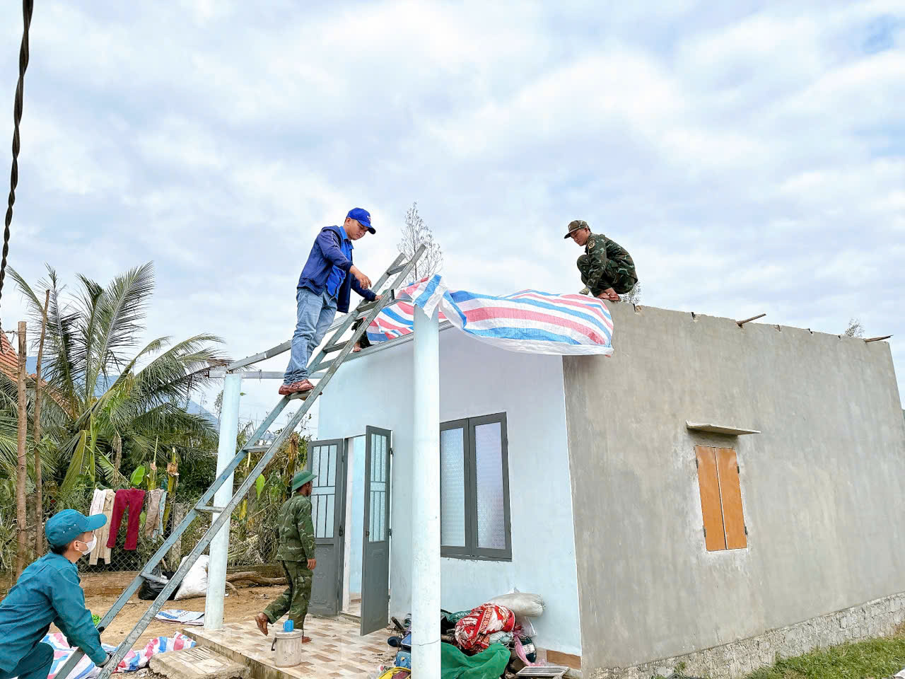 Các lực lượng hỗ trợ người dân lợp bạt tạm thời chống mưa lụt trong đợt mưa tới