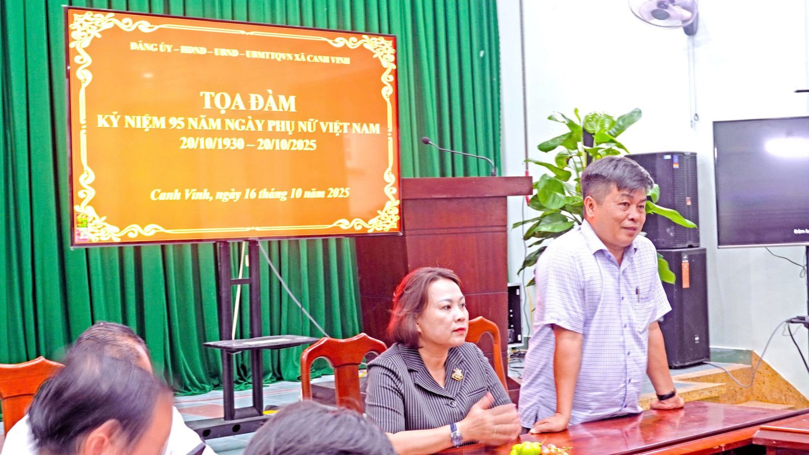Tại buổi tọa đàm, lãnh đạo Đảng ủy, HĐND, UBND, UBMTTQVN xã Canh Vinh gửi lời chúc mừng tốt đẹp nhất đến toàn thể chị em phụ nữ nhân kỷ niệm 95 năm Ngày Phụ nữ Việt Nam. Đồng chí lãnh đạo nhấn mạnh, phụ nữ luôn là lực lượng quan trọng trong mọi lĩnh vực của đời sống xã hội, đóng góp to lớn vào sự phát triển của địa phương. Buổi gặp gỡ không chỉ là dịp tri ân mà còn là cơ hội để lắng nghe, thấu hiểu và tiếp tục quan tâm, tạo điều kiện cho phụ nữ phát huy vai trò, năng lực trong công tác, trong gia đình và cộng đồng.