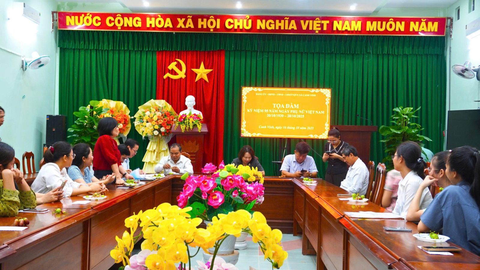 Không gian buổi tọa đàm được trang trí trang trọng với sắc đỏ – vàng truyền thống cùng những lẵng hoa tươi thắm. Dưới sự chủ trì của lãnh đạo xã, các đại biểu và hội viên phụ nữ cùng nhau ôn lại chặng đường 95 năm đầy tự hào của Phụ nữ Việt Nam. Buổi tọa đàm đã khép lại trong không khí ấm áp, đoàn kết và phấn khởi. Đây là dịp để toàn thể chị em phụ nữ xã Canh Vinh nhìn lại những nỗ lực, cống hiến của mình, tiếp thêm động lực để không ngừng rèn luyện, cống hiến, xây dựng tổ chức Hội ngày càng vững mạnh.